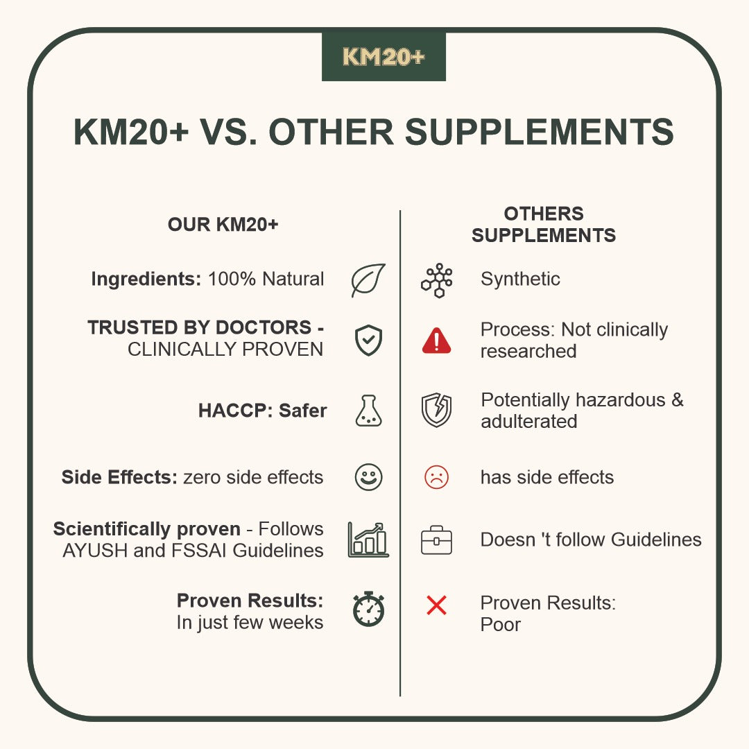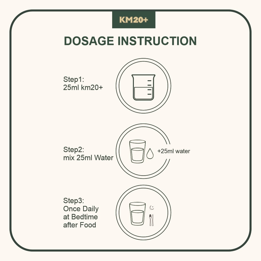 Pack Size: 750ml premium glass bottle Dosage: Mix 25ml KM20 + 25ml water, once daily at bedtime after food Delivery: Ships across India in 3–5 working days